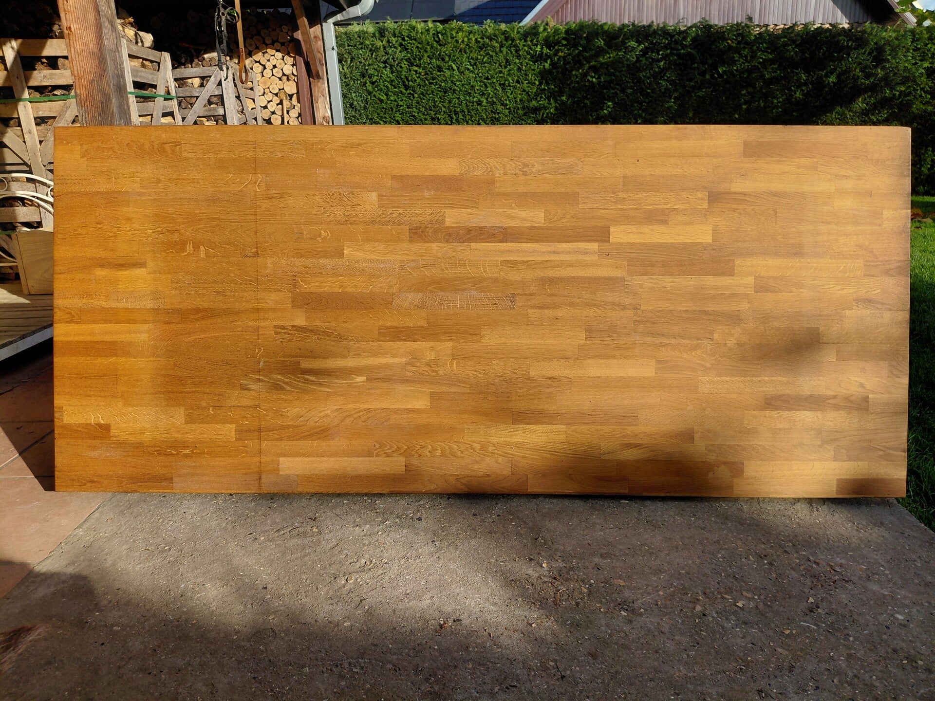 Massief eiken tafelblad. L 2m10cm. B 90cm. D 4cm.