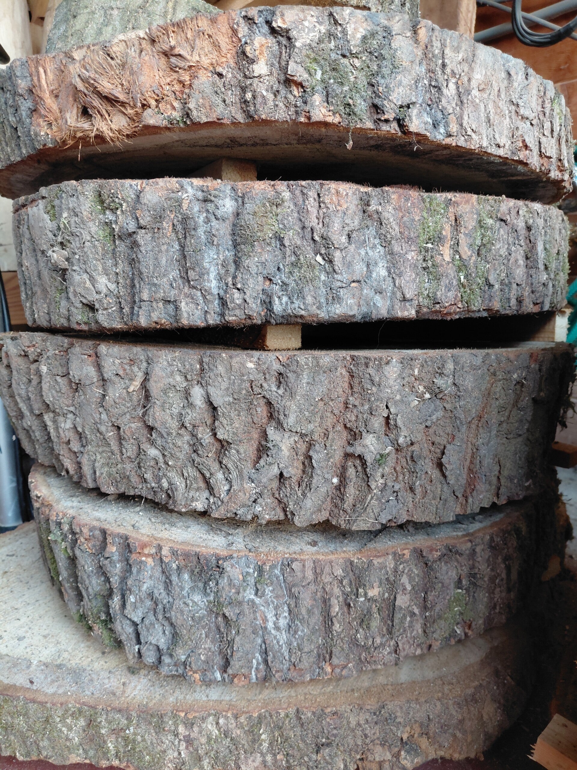 Eiken boomstamschijven. Haal de natuur in huis. Deze eiken boomstamschijven kunnen gebruikt worden als decoratie of er kunnen tafels van gemaakt worden. Ook kaasplanken, broodplanken, vleesplanken, plateaus voor kattenpalen.... Noem maar op. Dikte rond de 5cm. Diameter tussen de 40cm en 50cm. Uit te kiezen aan 25euro. Indien gewenst kan je ook boomstam blokken in eik bij ons kopen. Dan kan je deze zelf zagen en kom je nog goedkoper... Een boomstam blok van die diameter kost bij Hoeve Marie Louise 35euro. Hier kan je minstens 5 schijven uit zagen. Wat maakt dat elke schijf je 7euro kost.